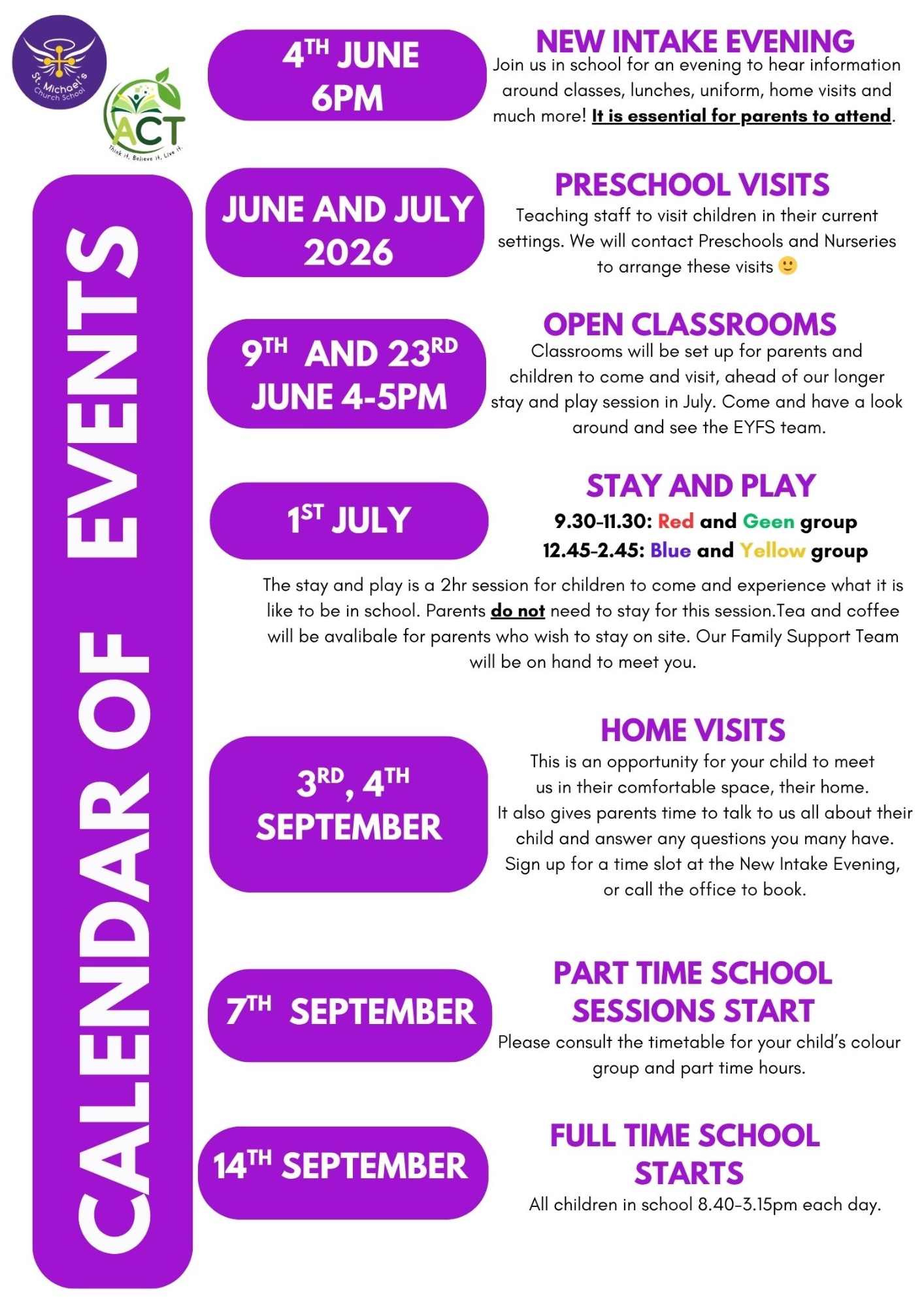 Starting school for the first time can be a little daunting. We want to make you and your child/ren feel very welcome and 'at home' at St Michael's as quickly as possible. We will invite you to our parent information evening which will be held on Thursday 4th June. Please see the below poster for important dates for your diary.
